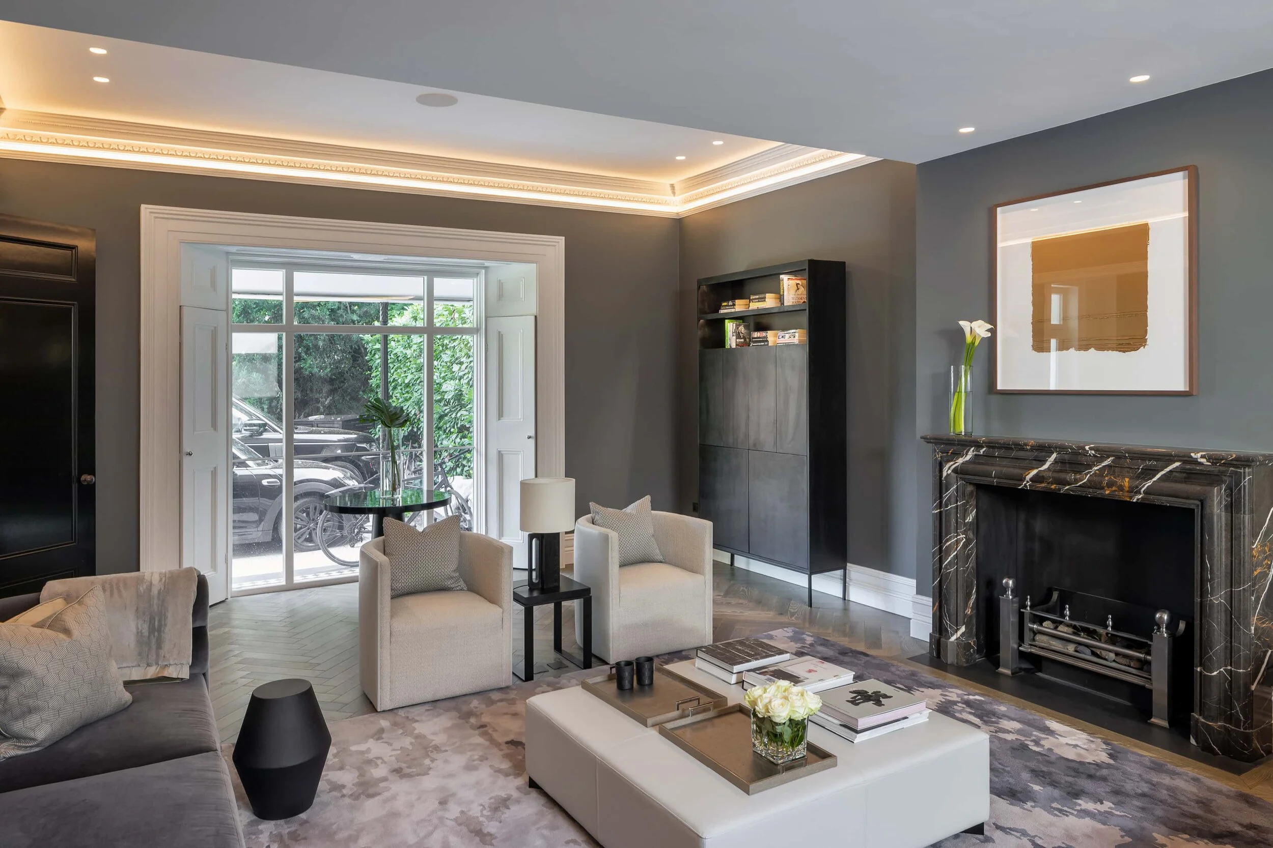 Interior design and decoration of large private family home. The ground floor features a drawing room with restored plasterwork and cornicing, study, guest WC and kitchen with pantry, plus dining and TV areas, whilst the upper level encompasses four en suite bedrooms. The lower-ground has a full-size laundry, bedroom, gym and entertainment room with bar, linked to a sunken external terrace. Materials are tactile and luxurious, from velvet, silk and leather to Nero Marquina marble and custom-stained oak. The client’s extensive art collection is displayed in a classic salon hang, with new compositions introduced for contemporary balance.